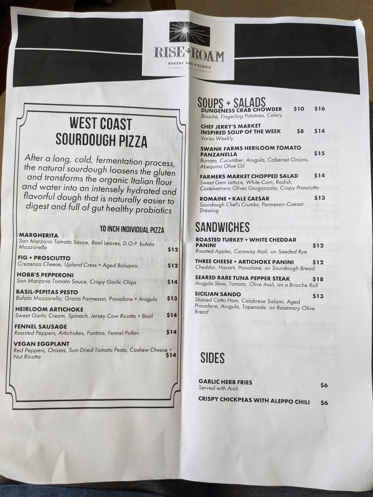 Rise + Roam Bakery and Pizzeria, located at Mission St & 7th Ave Carmel-by-the-Sea, CA, offers a delightful menu ranging from pizzas to sandwiches and baked goods. With a focus on quality and freshness, this establishment provides an array of options, including gluten-free, vegan, and vegetarian choices. Customers rave about the flavorful dishes, such as the gluten-free pepperoni pizza, carrot ginger cake, and berry danish. The cozy ambiance, friendly service, and extensive drink options, including wine and beer, enhance the dining experience. Whether you're looking for a quick bite to eat or a relaxing meal, Rise + Roam is a must-visit spot with its diverse menu and welcoming atmosphere.